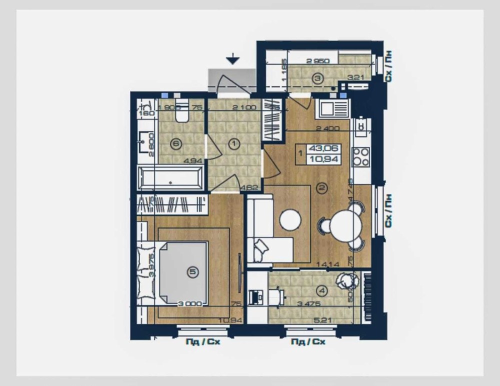 • Загальна площа 43 м2