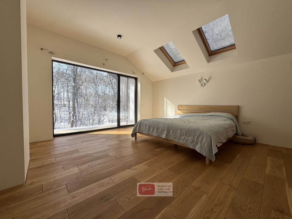Світло як мистецтво: Замінені звичайні вікна на преміальний алюміній (Польща, серія Slim) та додали мансардні вікна. Панорамне вікно розширено на 1.5 м² — це ваш особистий екран з живим лісом.
