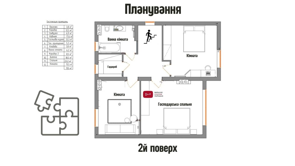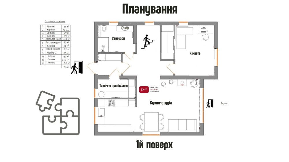 Складається з чотирьох кімнат, кухні вітальні з виходом на терасу, тех. приміщення та двох санвузлів.