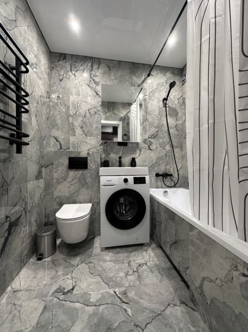 У кімнаті облаштована вбудована гардеробна. Всі меблі якісні, виготовлені під замовлення. Кухня з фарбованими фасадами, встановлена посудомийна машина.