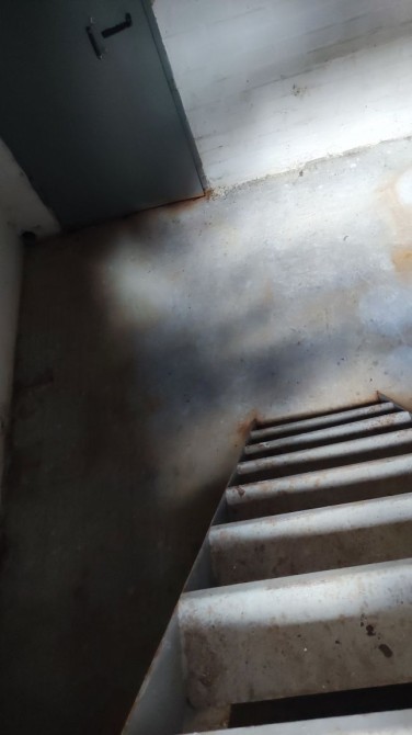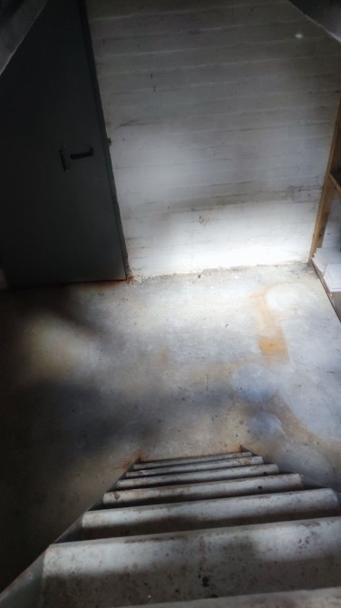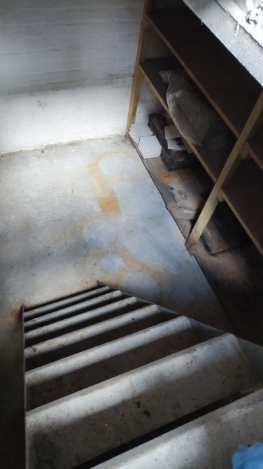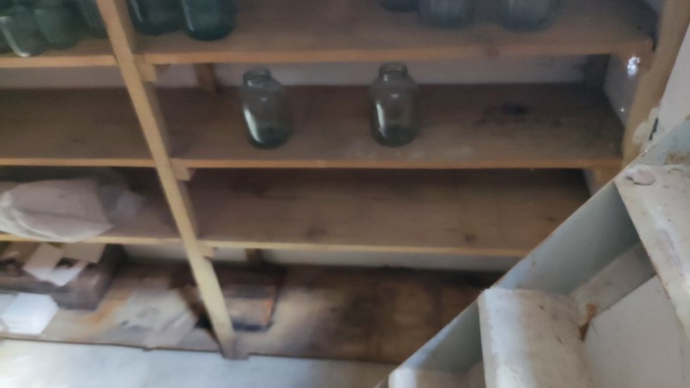 Є яма з металевими сходами, багато стелажів.