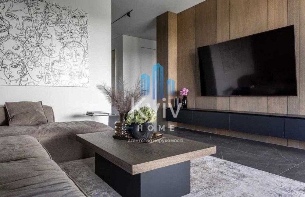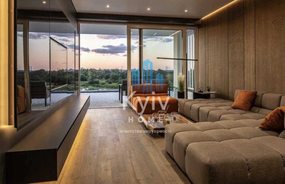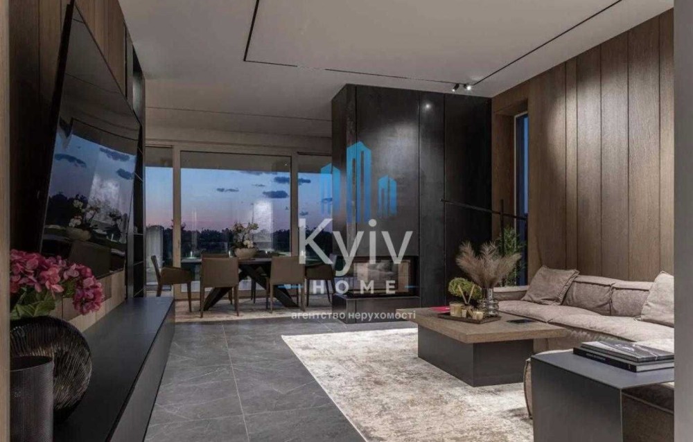 -Вітальня з двостороннім італійським каміном, м’які меблі INTERIOR, ТВ 65”.