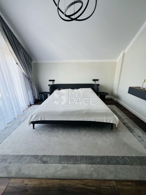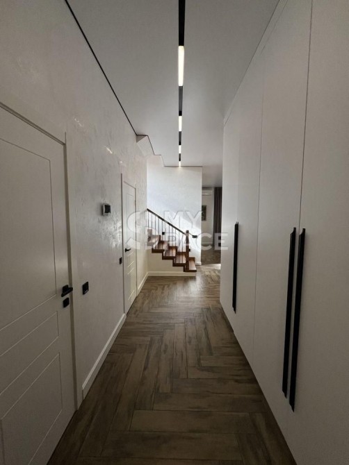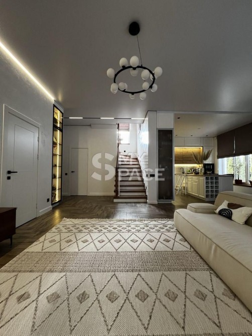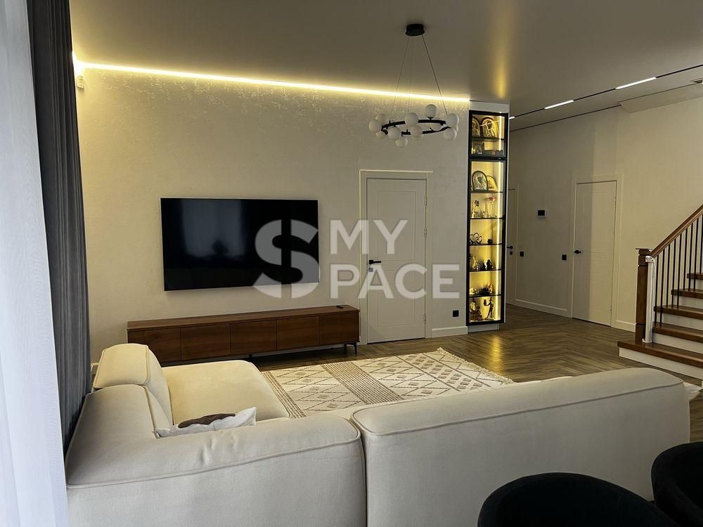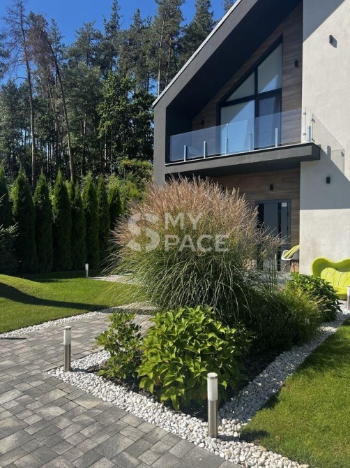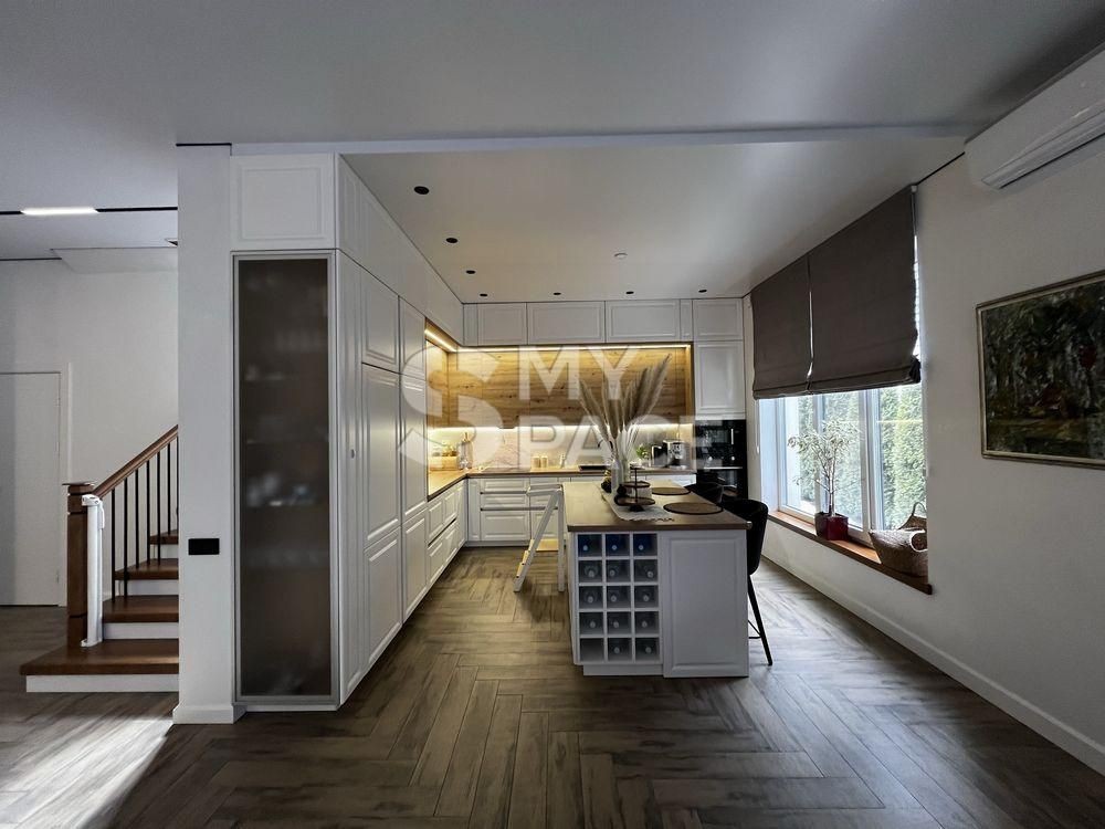 Продається сучасний будинок у стилі Barnhouse, розташований у котеджному містечку «Нова Ходосівка» на Новообухівському напрямку. Оселя знаходиться в самому центрі містечка, оточеного сосновим лісом, що забезпечує тишу, приватність і водночас зручний та швидкий доїзд до Києва. Будинок повністю готовий до проживання: виконано якісний ремонт, встановлено меблі та вся необхідна побутова техніка.Загальна площа будинку становить 210 м², житлова — 185 м², додатково є тераса площею 23 м². На ділянці також розміщена господарська будівля площею 11 м². Конструкція будинку передбачає стіни з керамоблоку, утеплення пінопластом, монолітні перекриття та покрівлю з металочерепиці.Планування продумане для комфортного життя. На першому поверсі розташована простора кухня-вітальня з виходом на терасу, кабінет із захисною металевою ролетою, санвузол та котельня, яка також виконує функцію постірочної. Другий поверх включає дитячу кімнату, спальню, санвузол і master-блок із власною спальнею, гардеробною площею 10 м² та окремим санвузлом.Кухня облаштована сучасним островом і повністю укомплектована технікою: варильною поверхнею, духовою шафою, мікрохвильовою піччю, посудомийною машиною, витяжкою, двома вбудованими холодильниками та морозильною камерою. Також встановлена система очищення води зворотного осмосу.Будинок оснащений усіма необхідними інженерними системами: електропостачання потужністю 20 кВт, власна свердловина з повною системою фільтрації, септик, швидкісний інтернет і сигналізація. Для комфорту встановлено п’ять інверторних кондиціонерів CooperHunter, електрокотел Bosch, а також пральну й сушильну машини. Для забезпечення автономності передбачений дизельний генератор потужністю 25 кВА, який може повністю забезпечити будинок електроенергією.Територія ділянки доглянута та облаштована: виконано ландшафтний дизайн, встановлено систему автополиву та декоративне підсвічування, облаштовано зону барбекю. Є паркування на два автомобілі, автоматичні ворота та домофон.Будинок розташований на асфальтованій, освітленій вулиці. Поруч знаходяться сосновий ліс, дитячий майданчик, а також проживають респектабельні сусіди.