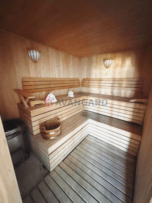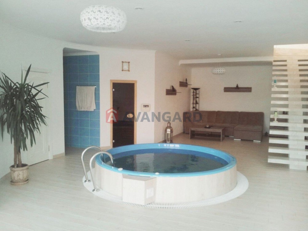 Якщо ж спуститися із вітальні на цокольний поверх, що має вихід на галявину з боку річки, то тут знаходиться сауна, кімната відпочинку 58 м² з басейном, душова, санвузол, топочна. А ще гостьова кімната 15 м² із окремим входом із усіма зручностями.