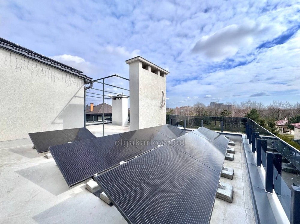 Есть электроаккумулятор и генератор. Запас воды 20 кубов. Освещение. Охранная сигнализации. Солнечные панели. Дом полностью автономный