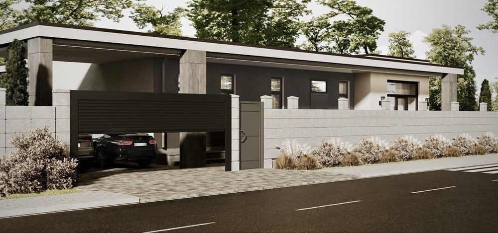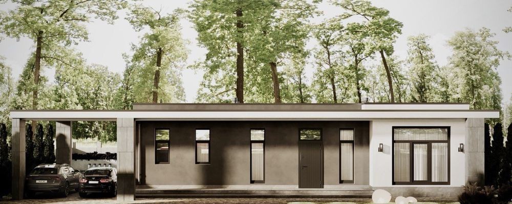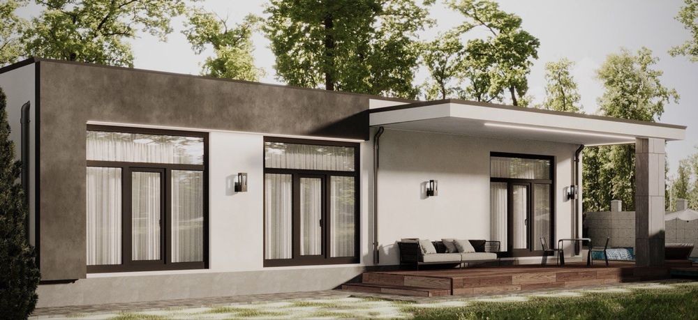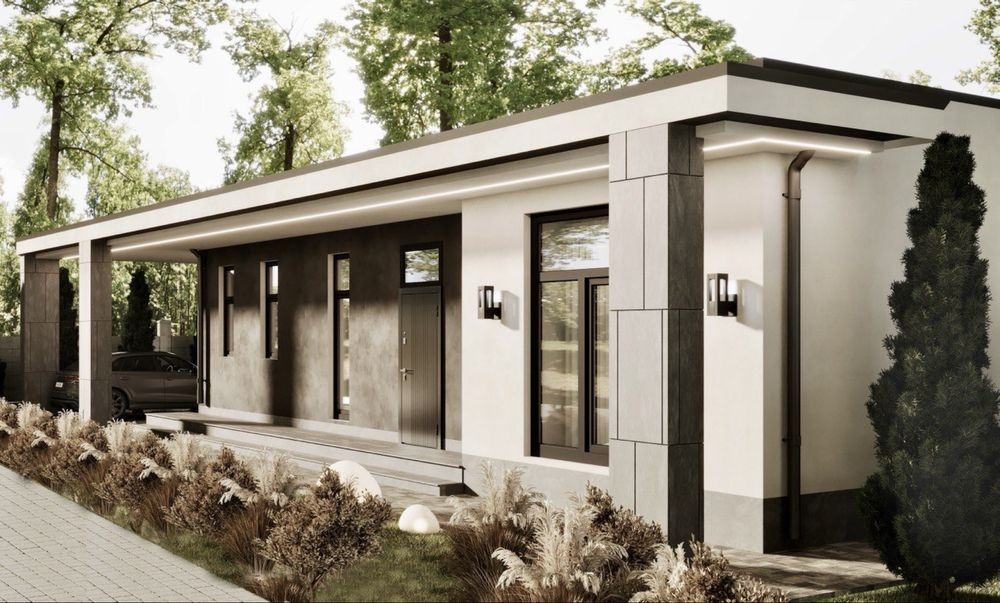 - Фасад — керамогранит широкоформатный + декоративная штукатурка