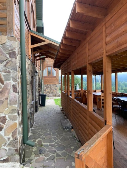 Структура котеджу — металевий каркас, брус, утеплювач. Внутрішні стіни з дерев’яної вагонки, дерев’яна підлога. Перекриття – металочерепиця.