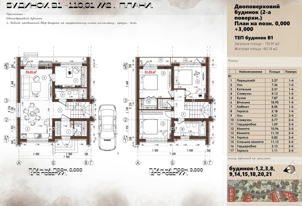 • Площа: 111 м², 2 поверхи.