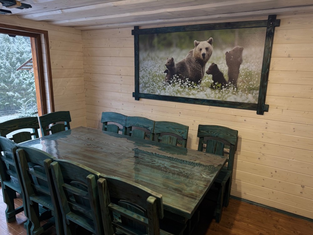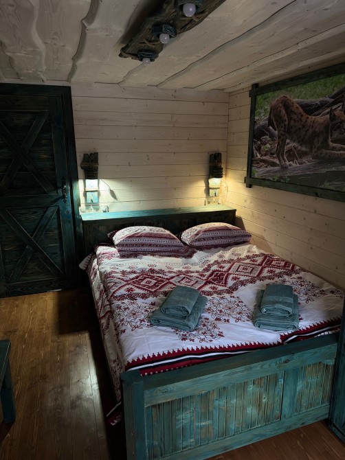 Ціна від 10000 грн. До 7 гостей -10000 грн за добу. Лазня та басейн оплачується окремо 5000 грн за добу або погодинно -1000 грн за годину.(Мінімум 4 години). Доплата за кожного наступного гостя 1000 грн. П’ятниця ,субота та неділя вартість оренди на 1000 грн вище. 332 Будинок-зруб з басейном з підігрівом та лазнею. 3 великі спальні, розрахований лише до 12 гостей, за стіл можна розмістити до 12 гостей та спальних місць 9. Приймаються тільки не гучні компанії. На території є альтанка з зоною барбекю, мангал, тенісний стіл. На першому поверсі: зал-студія, басейн з підігрівом та лазня. На другому поверсі 3 роздільні, просторі спальні. Лазня, басейн та квадроцикл оплачується окремо. Також можлива оренда без лазні та басейну. Будинок повністю обладнаний для комфортного проживання, є всі необхідні меблі та побутова техніка, є стіл на 8 персон та камін.