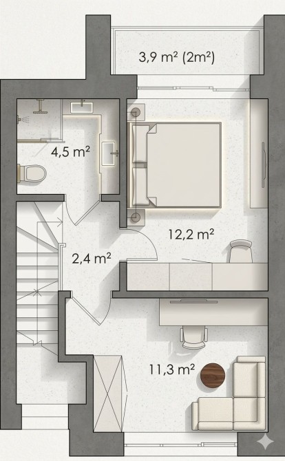Будинок двоповерховий, з комфортним плануванням для сім’ї: простора кухня-студія, дві окремі спальні, два санвузли, прихожа та балкон.