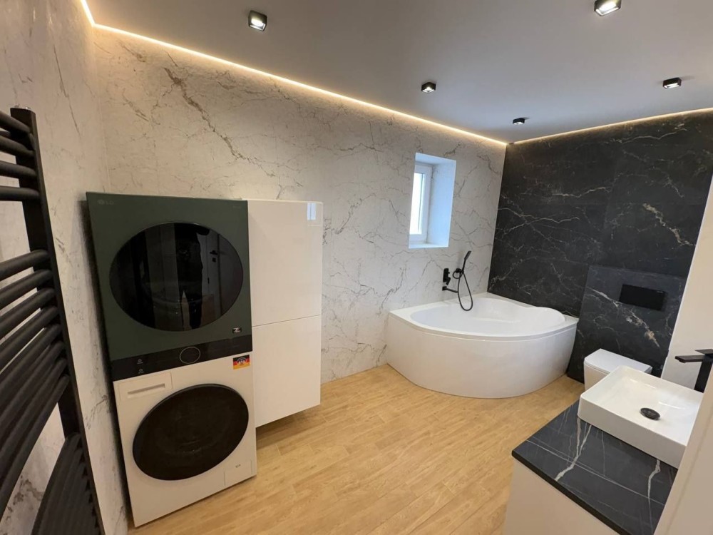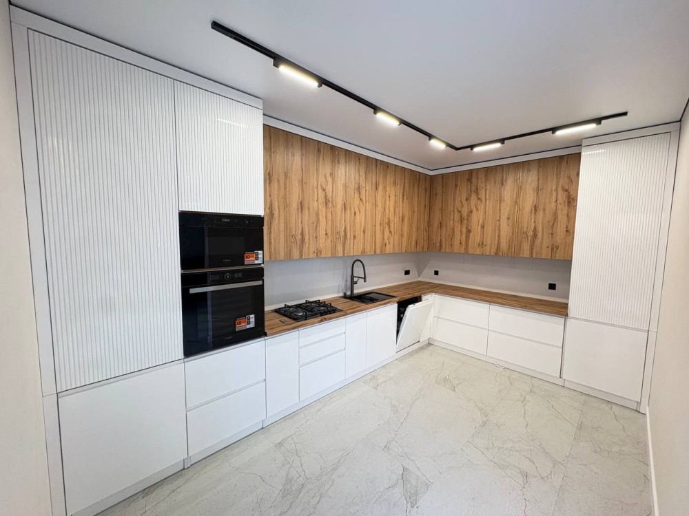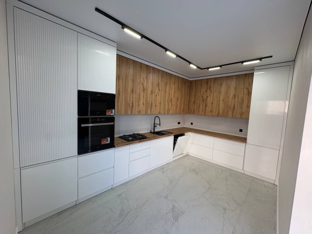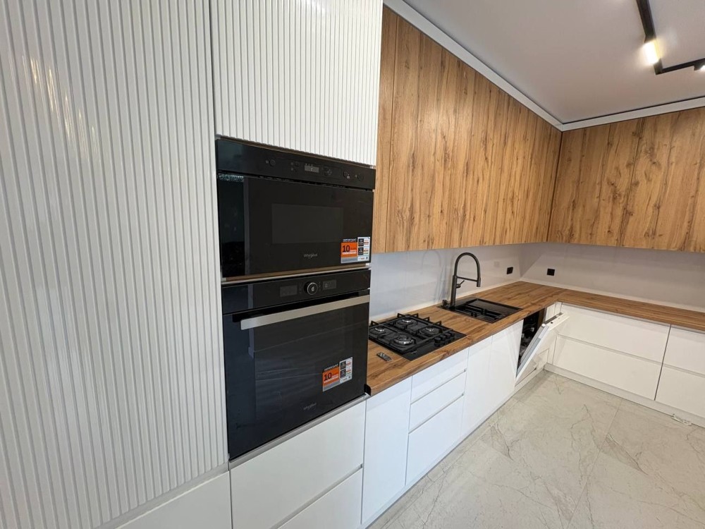 Вся техніка на кухні(духова шафа,посудомийна машина,мікрохвильова піч,вмонтований холодильник,варильна поверхня) нова,бренду Whirlpool,мякі меблі Frankof,пральна і сушильна машинка LG,дубові сходи.