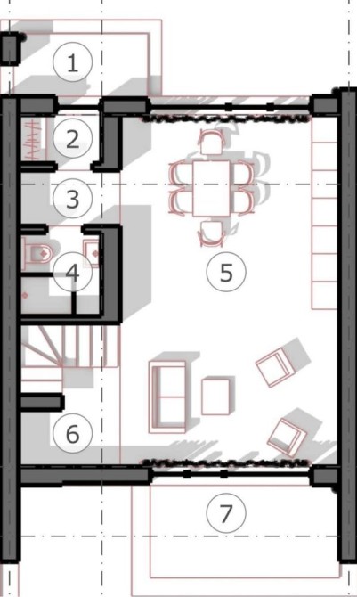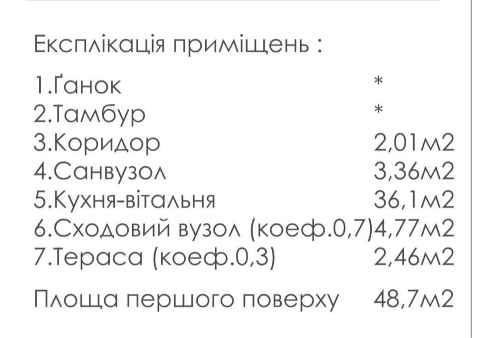 1 поверх — коридор, прихожа, санвузол, простора кухня-вітальня з виходом на терасу.