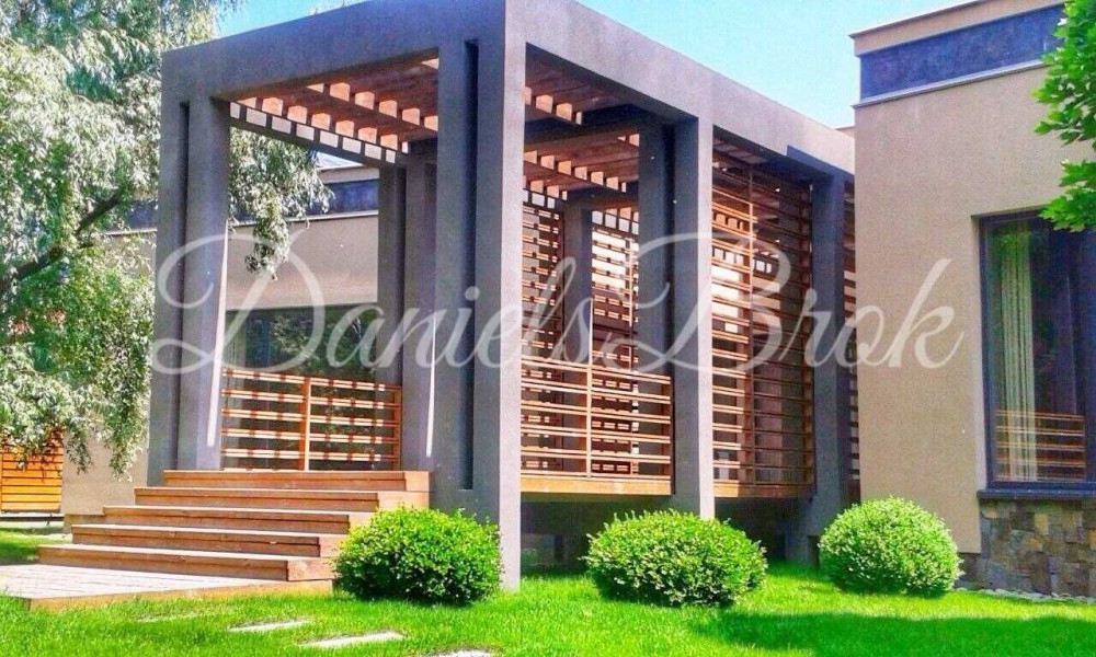 Конча Заспа, особняк элит-класса в стиле Hi-Tech, 750кв.м, в доме большой бассейн, гостиная с камином, 3 спальни, кухня-столовая, панорамные окна, 75 соток с выходом на р. Козинка, большие деревья, спортивная площадка, сауна на берегу реки Козинка, дорогая мебель, бытовая техника. Дом для охранника и прислуги. Недалеко от дома находится Гольф клуб.