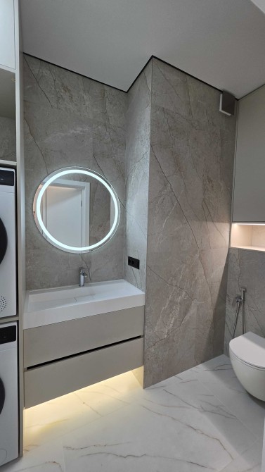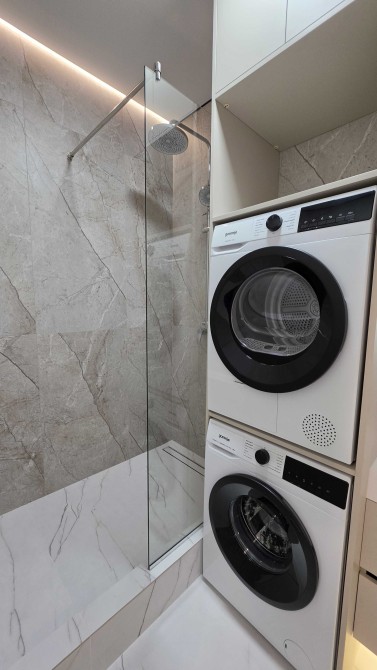 Вместительный сан.узел с продуманными местами для хранения, укомплектован стиральной и сушильной машинами.