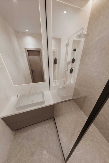 В квартире выполнены все черновые работы согласно дизайн проекта: перепланировка, электрика, разводка воды и канализации, выполнен монтаж систем кондиционирования и вентиляции, установлены электрические розетки и выключатели.