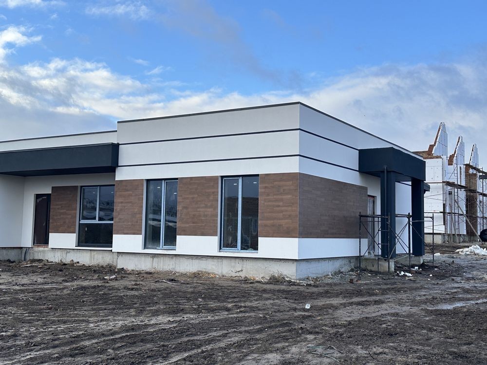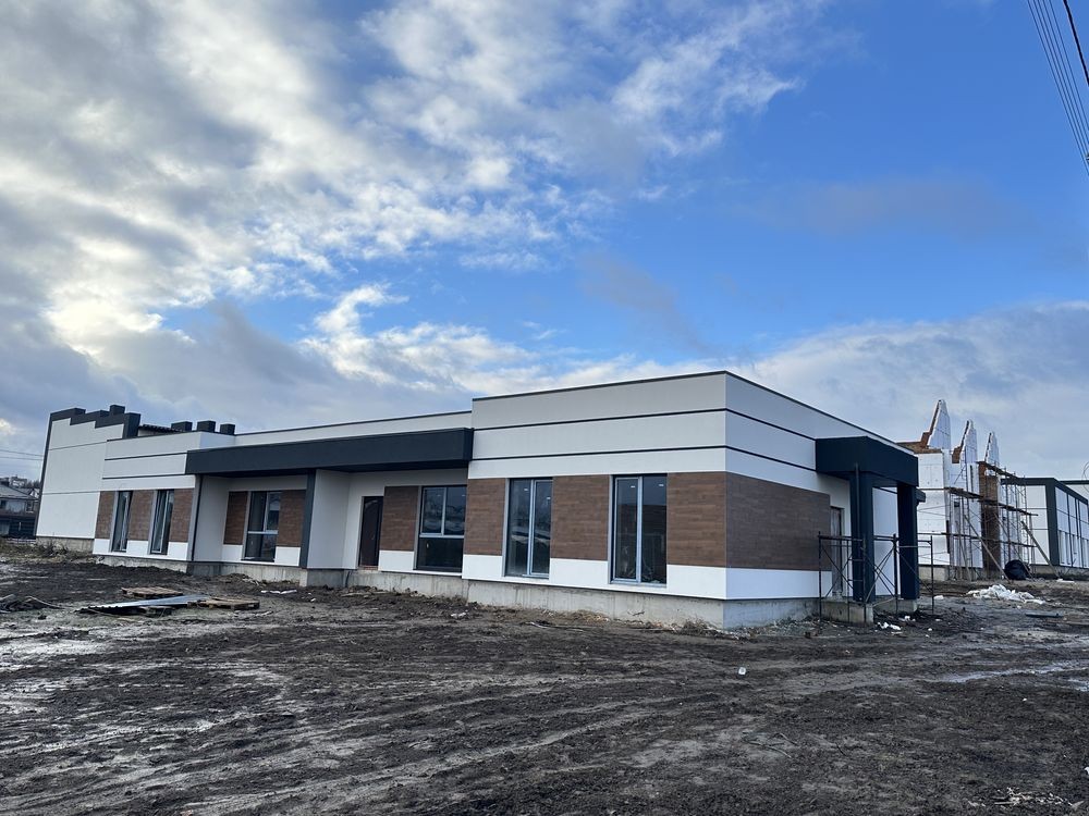 В котеджі проведені штукатурні. Продумане планування - 3 окремі спальні та кухня вітальня з великим терасним вікном. Гардеробна кімната , санвузол та вхідна група.