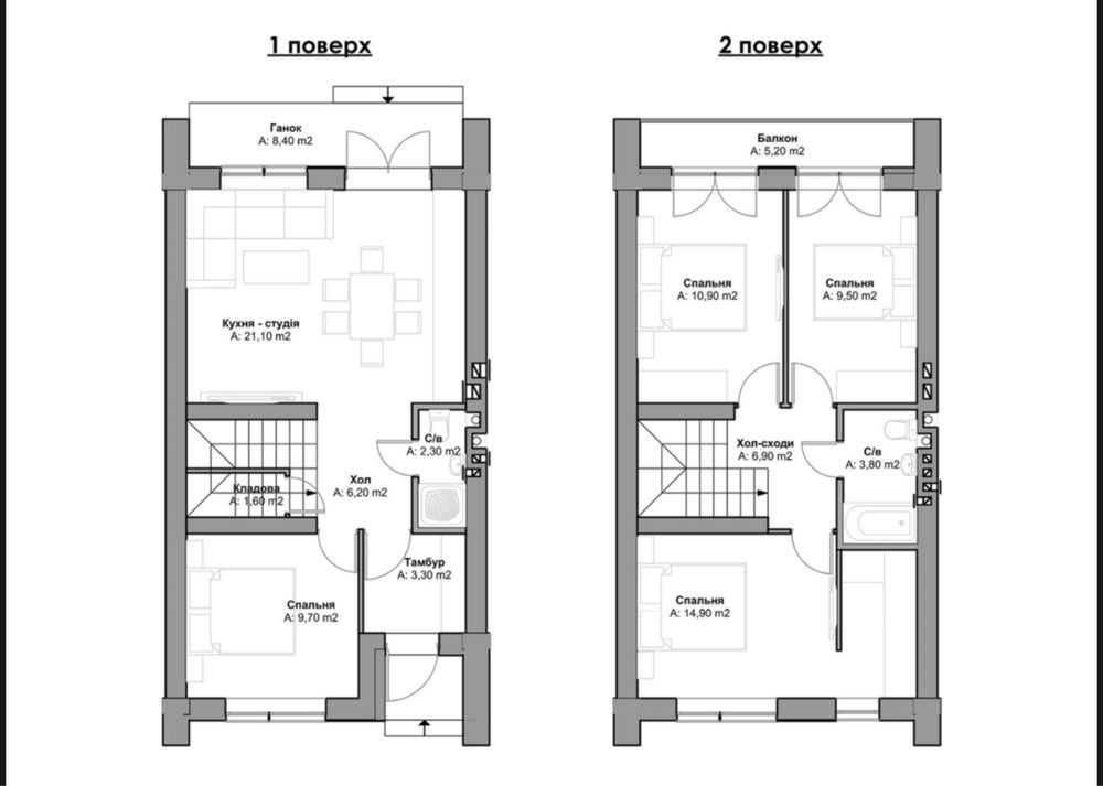 Площа 103 м2 - 4 роздільні спальні, велика кухня-вітальня, санвузли великі на обох поверхах.