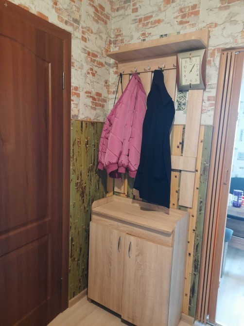 В коридорі вішалка і тумба для взуття,дзеркало.В кухні -кухонні меблі і куток з столиком.