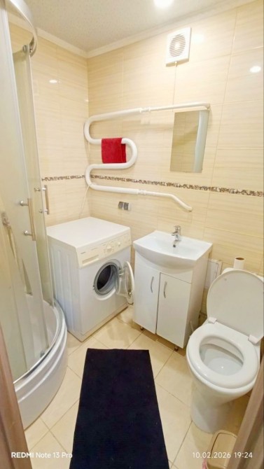 Є окрема ванна кімната з душовою кабіною, постійно гаряча вода, пральна машина.
