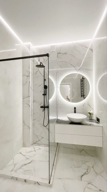 Тепла водяна підлога (всюди, де плитка), 2 виводи під кондиціонери, якісна електрика з розведеними автоматами, гігієнічний душ, підсвітки з димуванням, дизайнерські дзеркала — усе виконано за індивідуальним проєктом.