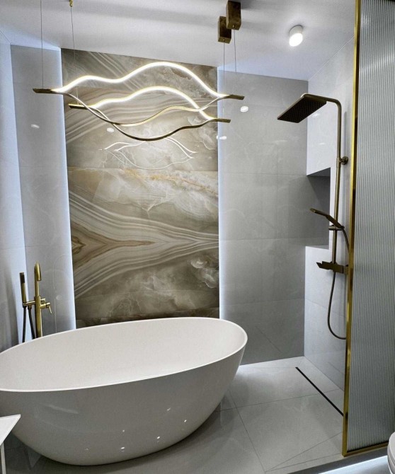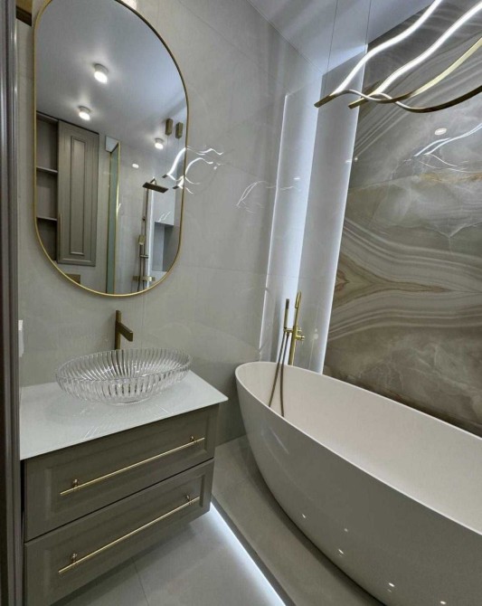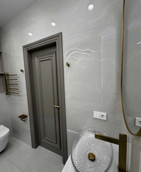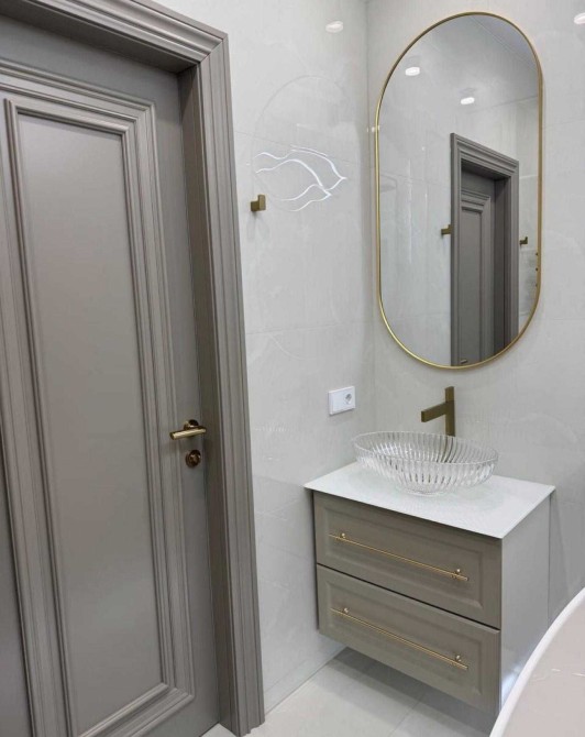 В отделке использованы инженерная доска, система тёплого пола, межкомнатные двери из массива натурального дерева. Интерьер дополняет отдельно стоящая ванна из искусственного камня — выразительный акцент, подчёркивающий эстетику и уровень комфорта. Квартира полностью укомплектована мебелью и техникой Whirlpool и Gorenje.