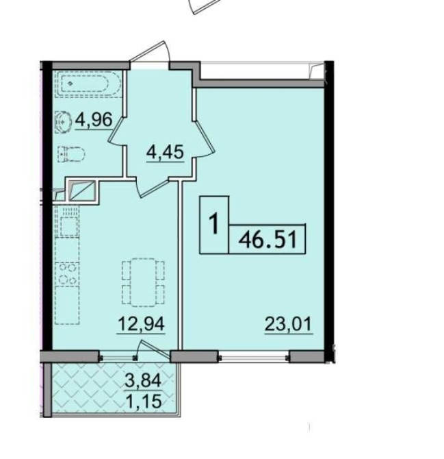 Отличная планировка: просторная кухня 12,94 кв.м с балконом и большая комната 23 кв.м, совмещенный санузел 4,96 кв.м.