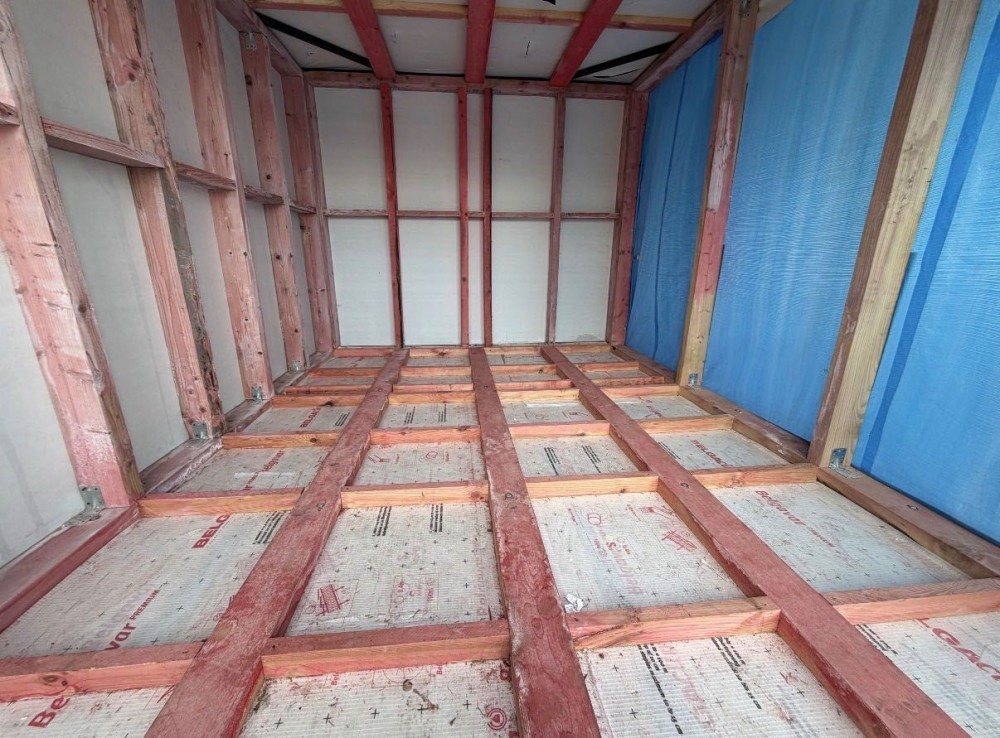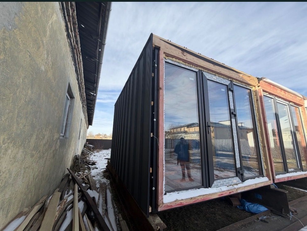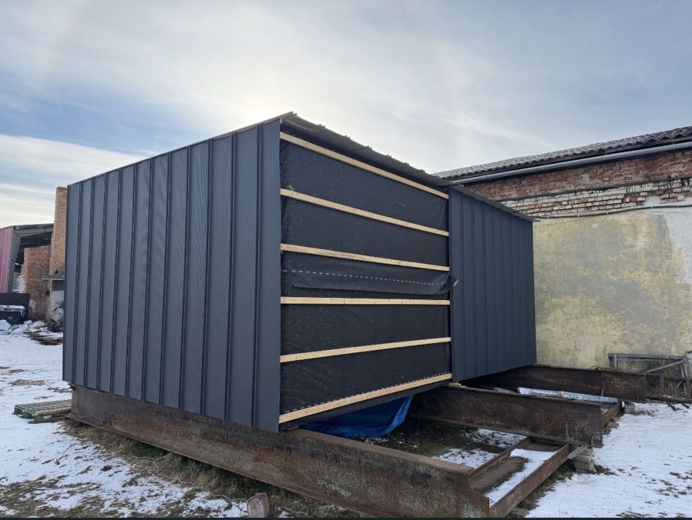 Каркас залізний поєднаний з брусом.Паробарєр,вітробарєр все зашито якісно,вікна дорогі фірми вікнароф мав бути модульний будинок.Підходитья для мафу або для будинку на оренду.Задня частина бляхи є та буде зашито.