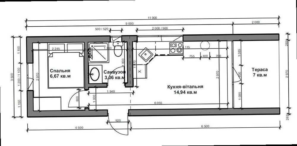 Спальня: Окрема кімната для відпочинку з можливістю розміщення двоспального ліжка та шафи.