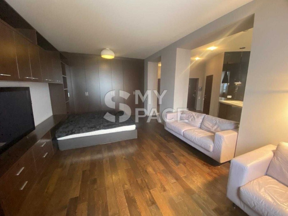 Житлова зона поєднує спальню та вітальню: просторе ліжко, м’який диван, вбудовані шафи на всю стіну, що забезпечують достатньо місця для зберігання. Дерев’яна підлога додає затишку та тепла інтер’єру.