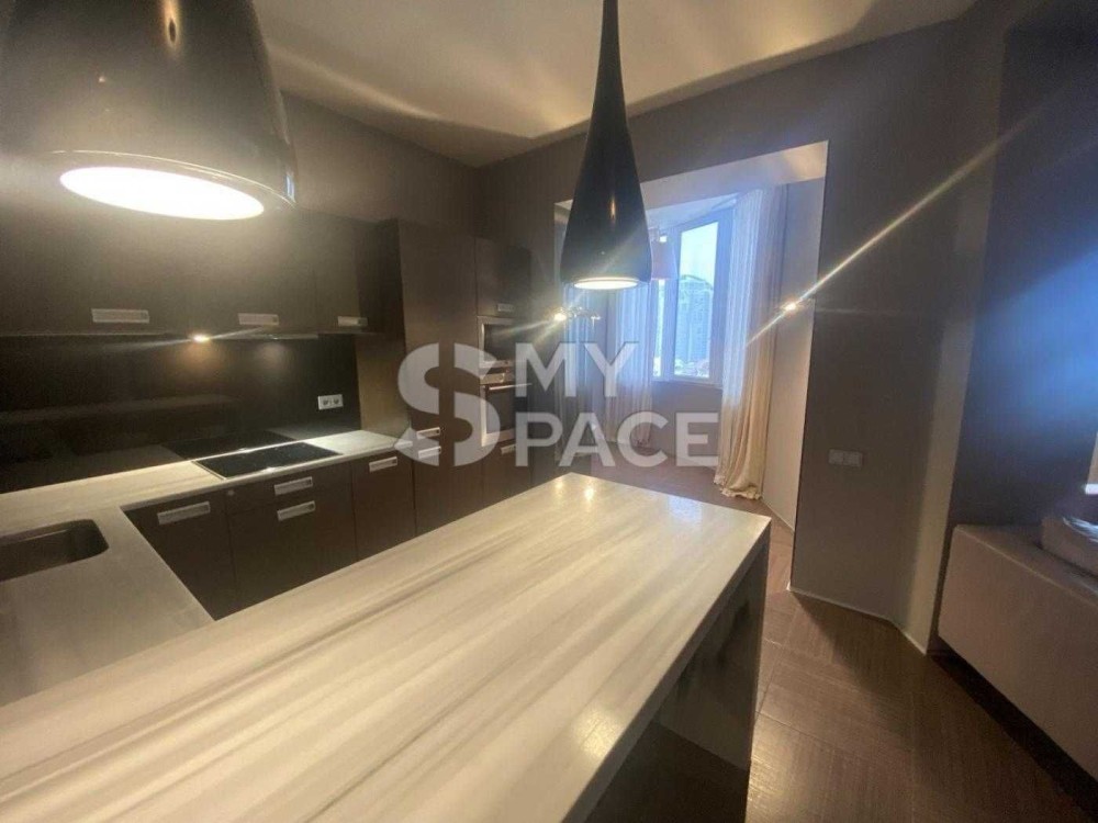Кухня повністю обладнана: вбудовані меблі, варильна поверхня, духова шафа, витяжка, посудомийна машина, холодильник. Острів з робочою поверхнею може використовуватись як обідня зона. Сучасне освітлення підкреслює стиль та функціональність простору.