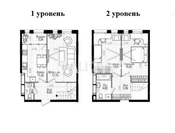 Перший рівень: кухня 11м з лоджією, вітальня 18м, санвузол. На другому рівні дві кімнати по 14 та 15м. Засклена лоджія, панорамні вікна, вбиральня. У будинку 3 ліфти. Стан – після будівельників. У будинку є своя котельня, цілодобова охорона, двір без машин. Дуже зручна транспортна розв'язка – до метро Деміївська 10 хвилин міським транспортом.