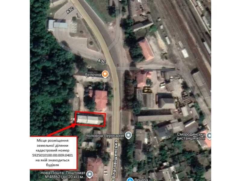 Капітальна господарська одноповерхова будівля прямокутної форми з шиферною покрівлею, що знаходиться в центральній частині міста Тростянець біля дороги національного значення Н-12 Суми – Полтава. Загальна площа будівлі 222,1 кв.м, що складається з основної частини приміщень площею 170,9 кв.м, збудованих у 1906 році з цегли, яка вирізняється високою якістю та міцністю, а також цегляної добудови періоду 1950 – 60 років площею 51,2 кв.м. Над середньою частиною будівлі є надбудова. Будівля складається з чотирьох складських приміщень площею 9,4 кв.м, 10,4 кв.м, 23,7 кв.м та 36,1 кв.м, приміщення мийки площею 50,4 кв.м, приміщення майстерні площею 59,1 кв.м з облаштованими двома оглядовими гаражними ямами: площею 8,1 кв.м та висотою 1,55 м, площею 5,2 кв.м та висотою, 1,55 м, кімнати для персоналу, кабінету, коридору та санвузла. Висота приміщень будівлі 3,30 м, підлога бетонна. Будівля має задовільний технічний стан, обладнана електропостачанням потужністю 10 кВт з можливістю збільшення потужності за умови розроблення додаткових технічних умов, централізованим водопостачанням, локальним водовідведенням з можливістю приєднання до центрального каналізаційного колектору. На бічній стіні будівлі розміщується труба газопроводу низького тиску діаметром 32 мм, на відстані біля 1 м вздовж тильної сторони будівлі прокладена труба газопроводу середнього тиску діаметром 89 мм, отже є можливість приєднати будівлю до відповідного газопроводу та забезпечити газопостачанням. Комерційною привабливістю даного об’єкта є його місце розташування: центральна частина міста, на відстані біля 10 метрів від автомобільної дороги національного значення Н-12 Суми – Полтава, з якої облаштований зручний асфальтований під’їзд. В даному місці добре розвинена соціальна інфраструктура: поруч магазини, заклад охорони здоров’я, аптека, центральний ринок, зупинка громадського транспорту, на відстані біля 300 м залізничний вокзал. Дуже зручне місце для ведення прибуткового бізнесу, має велику перспективу та інтенсивний трафік автомобілів поруч. Ідеально підходить під склад, невелике виробництво, автомайстерню, автосервіс та таке інше
