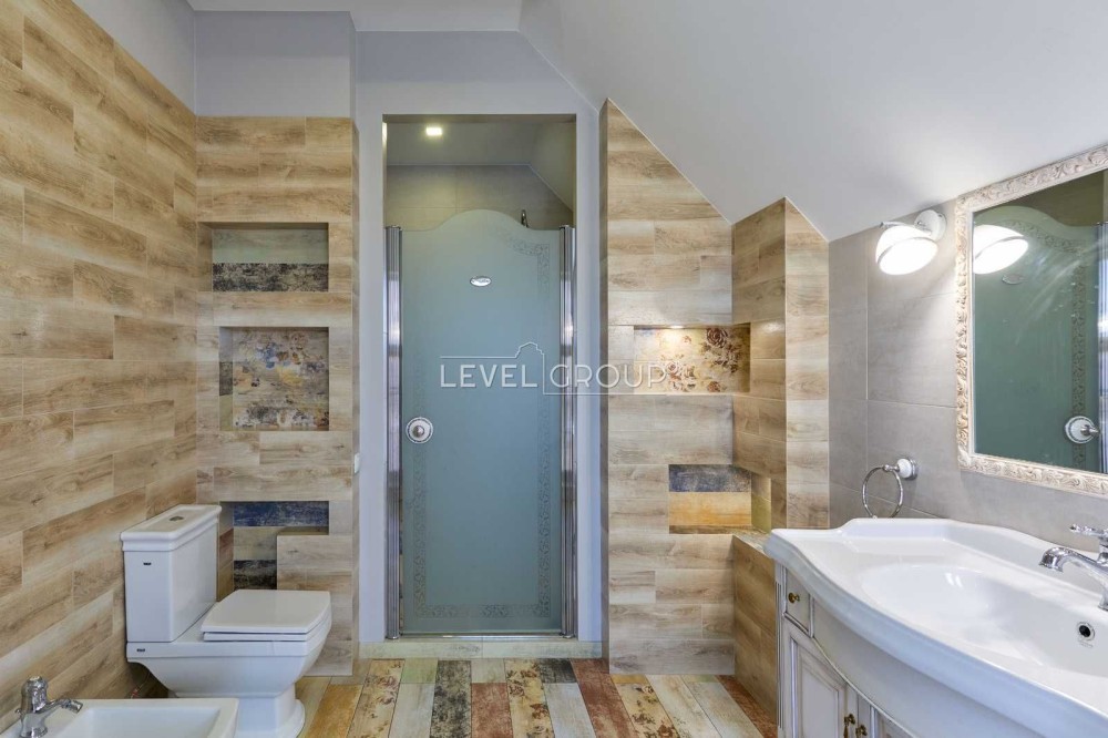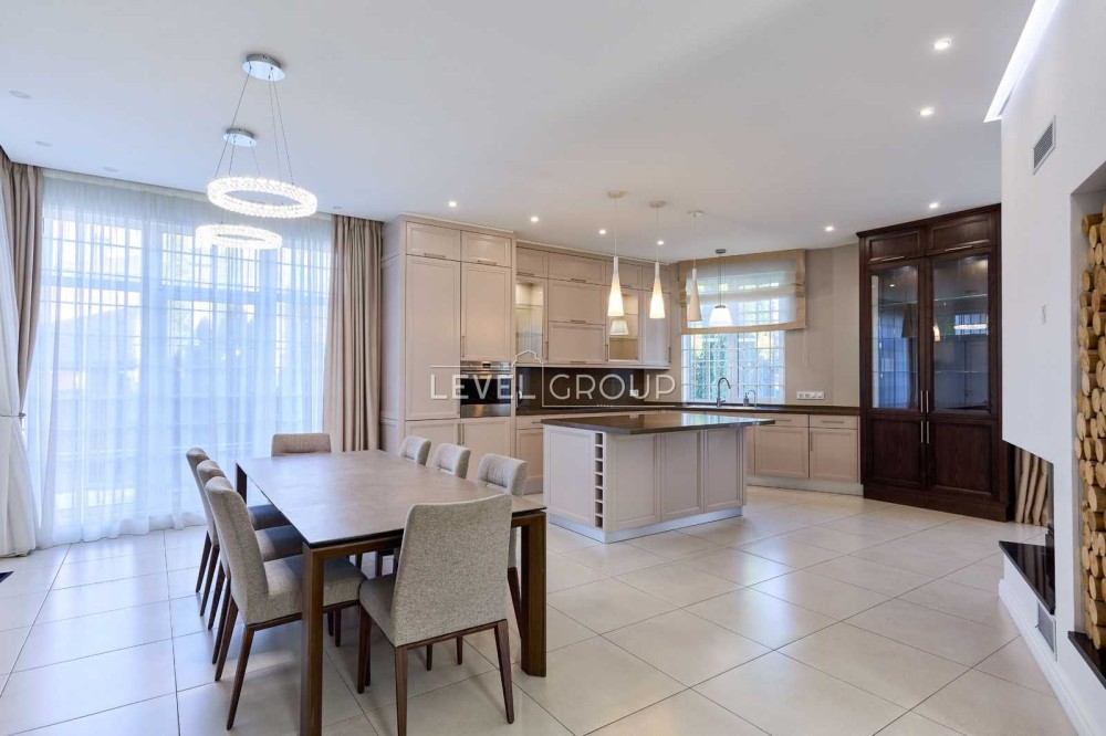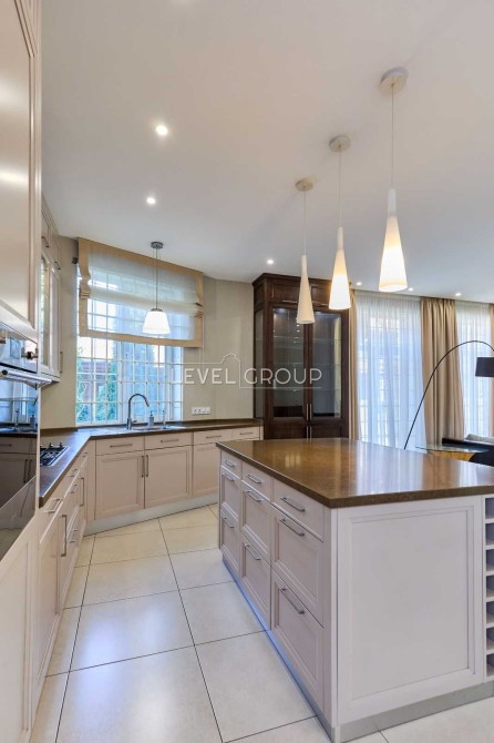 В інтер’єрі використані преміальні матеріали: італійська плитка, горіховий паркет, німецька сантехніка Grohe, HansGrohe та Villeroy Boch. Центральним елементом вітальні є діючий тристоронній камін.