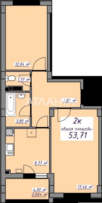 2-кімнатна квартира площею 54 м² у новому вже зданому будинку.