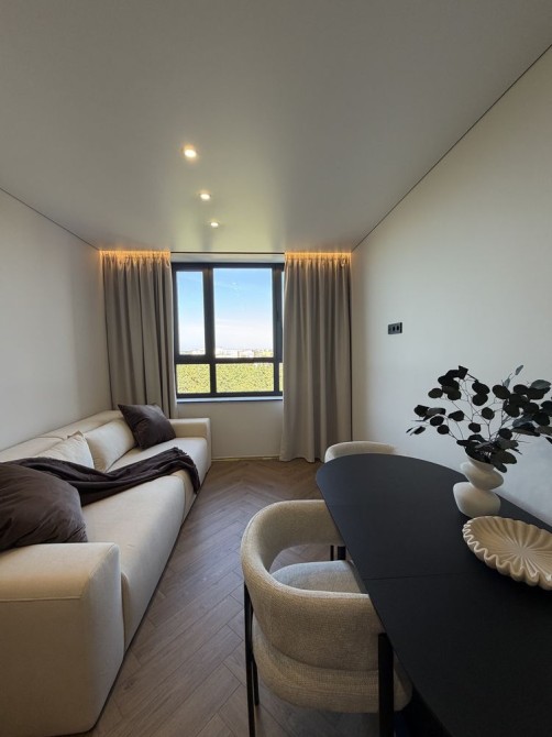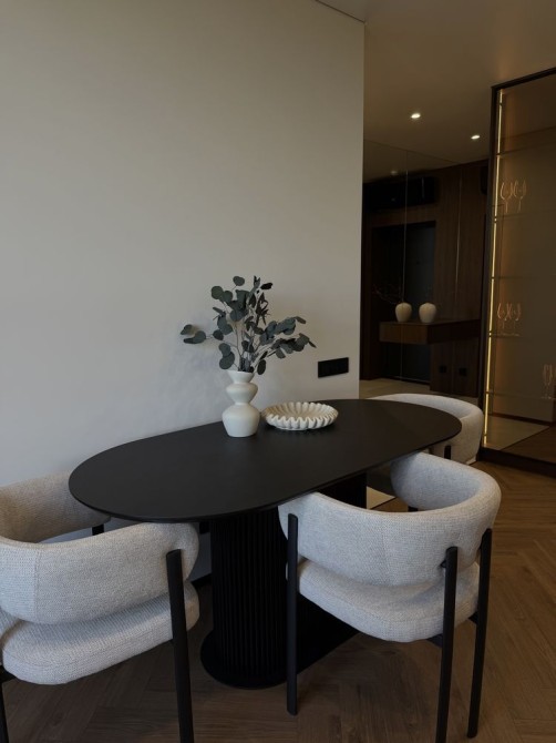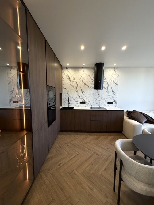 Максимально укомплектована меблями та технікою: посудомийна машинка, духова шафа, витяжка, мікрохвильовка, вмонтований холодильник, два кондиціонери, тепла підлога.