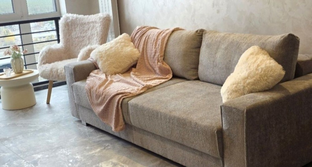 Телевізор 75” + саундбар, розкладний диван 200×220, лаунж-зона з двома кріслами та столиком.