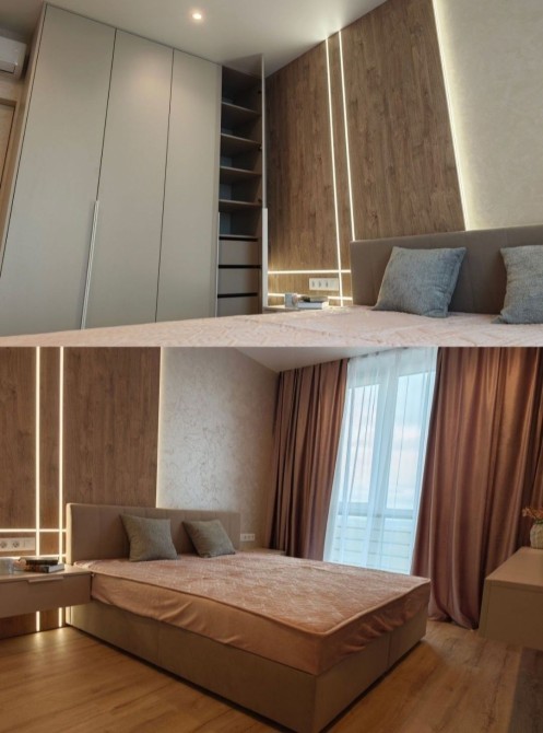 Ліжко 180×200, панно з підсвічуванням, шафа, великий телевізор 65”, будуарний куточок із дзеркалом у підлогу.