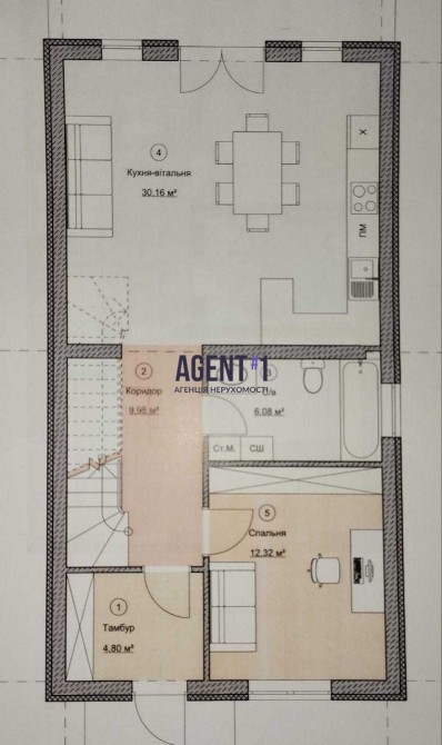 1-й поверх: передпокій, санвузол, окрема кімната, простора кухня-вітальня з виходом на терасу;