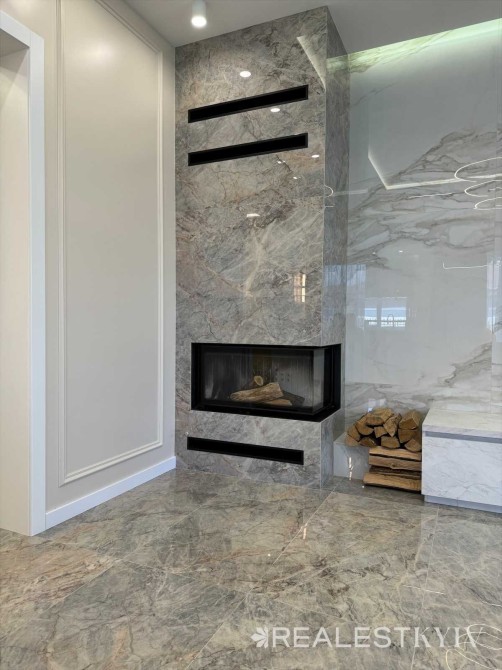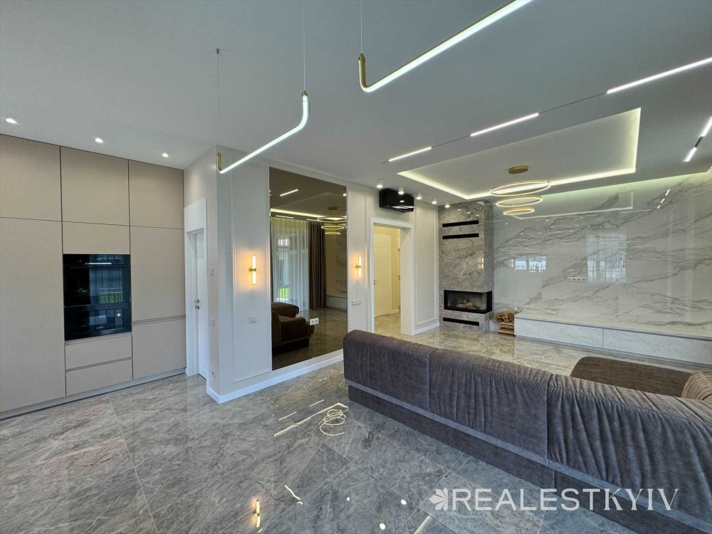 велика вітальня з каміном та виходом на терасу, кухня з усією необхідною побутовою технікою, дві спальні кімнати, гардеробна, кабінет, 2 санвузли, котельня, прихожа.