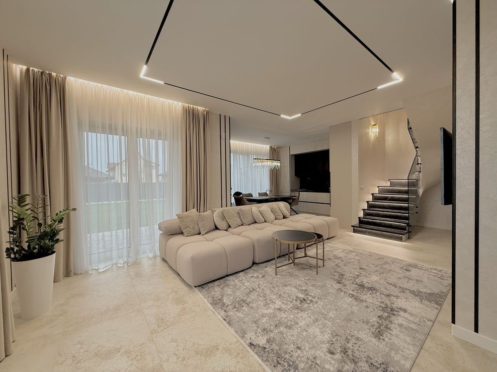 • Кухня-вітальня з виходом на терасу, гардероб, гостьовий санвузол, гараж з автоматичними воротами Hormann та робоча кухня-паливна з входом в підвал на першому поверсі