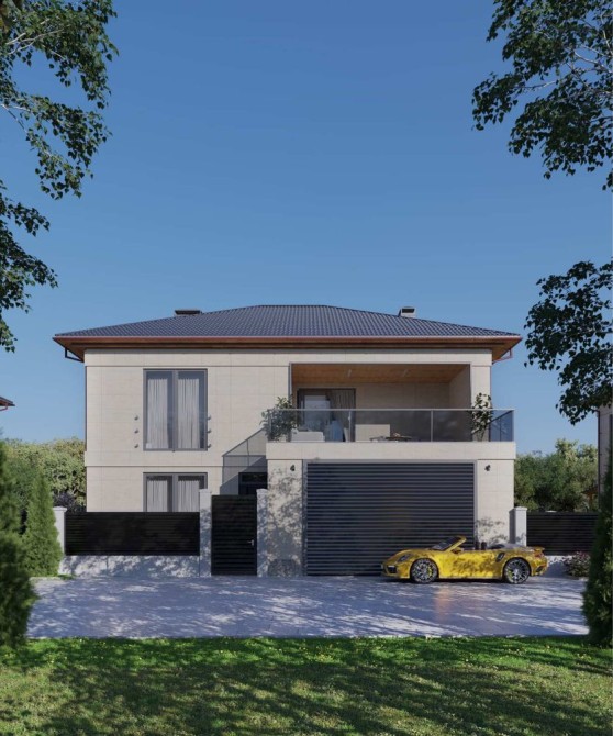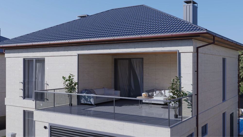 Современный кирпичный дом 300 м² с подвалом, премиальным фасадом из натурального травертина и полной подготовкой под чистовую отделку.