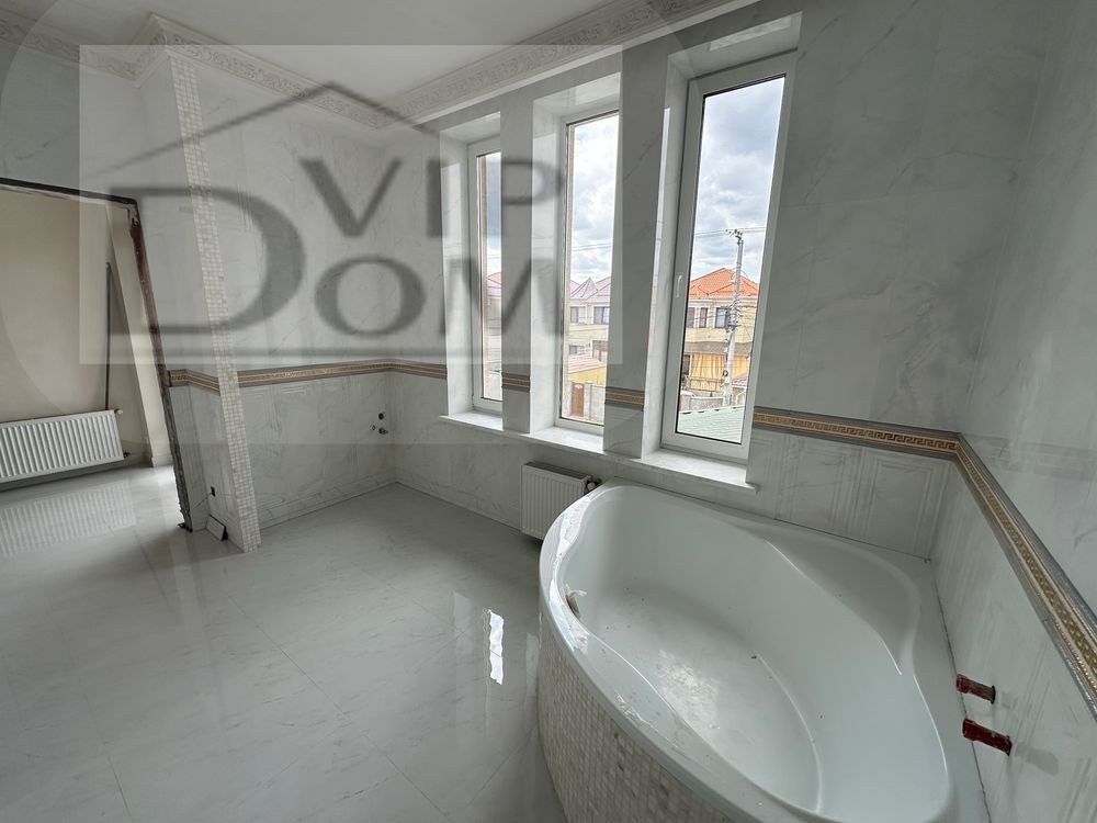 — Санузел с потрясащей ванной, с тремя окнами.