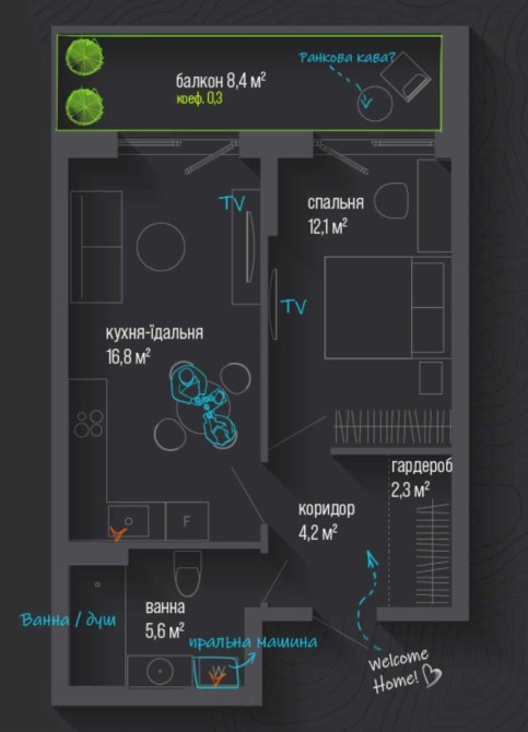 Сучасне планування, багато світла, панорамні вікна. Комплекс закритого типу з пішохідними зонами, великою зеленою територією, власною інфраструктурою, зонами відпочинку та спорту. Поруч усе необхідне для щоденного життя.