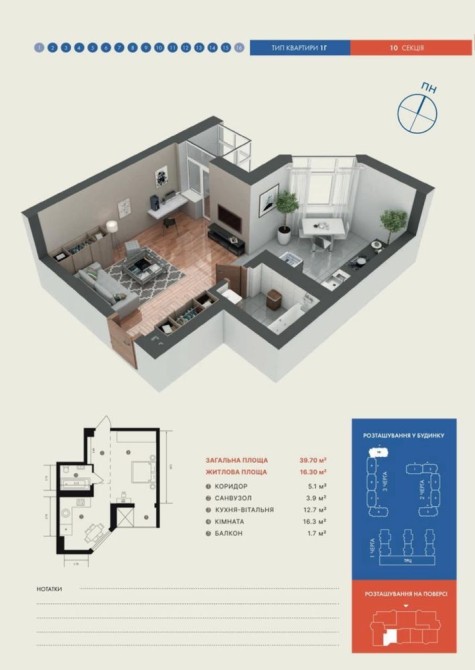Однокімнатна квартира 39,7 м2.