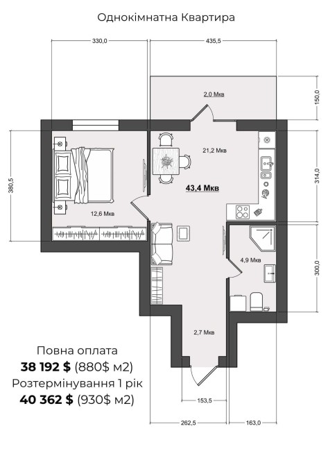 Ціна: 38 192$ ( 880$ м2 )