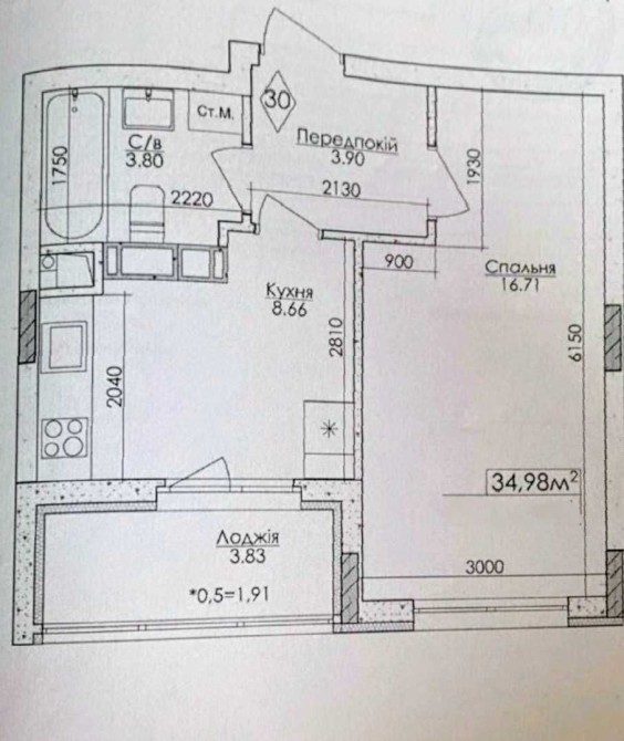 санвузол - 3,8 м², житлова площа - 16,71 м² + балкон