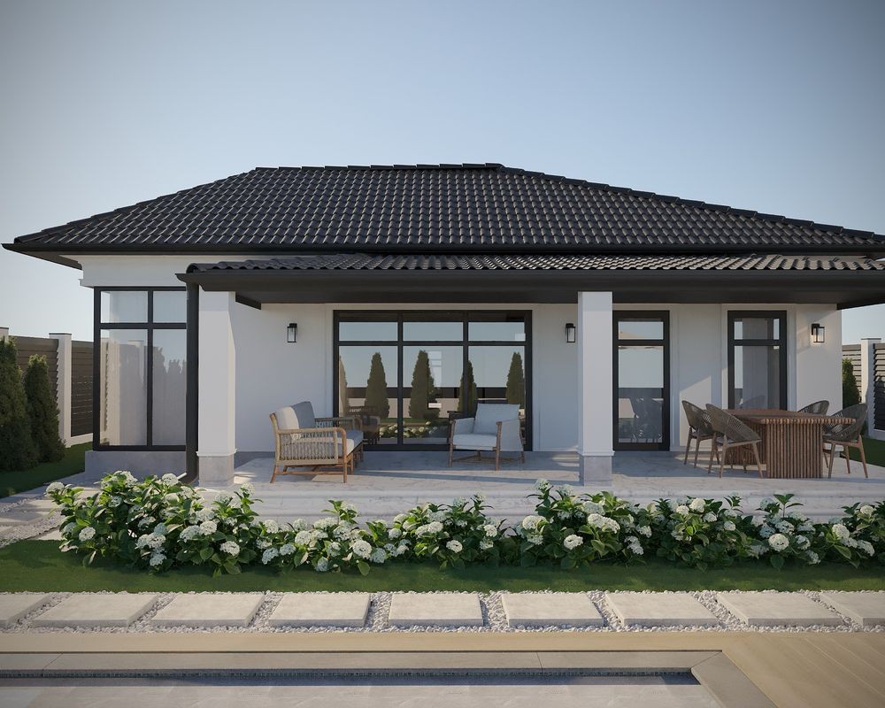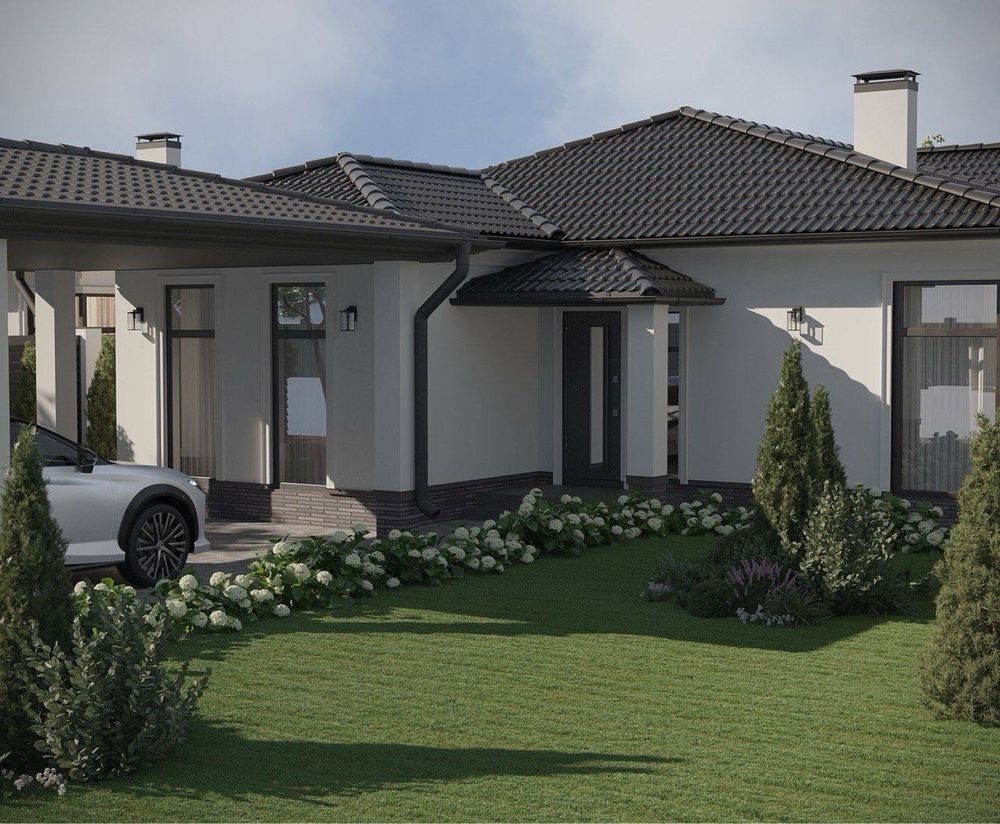 Будинок виконаний у світлому класичному стилі з темно-сірою черепицею. Стильний, лаконічний фасад, який виглядає дорого та актуально.