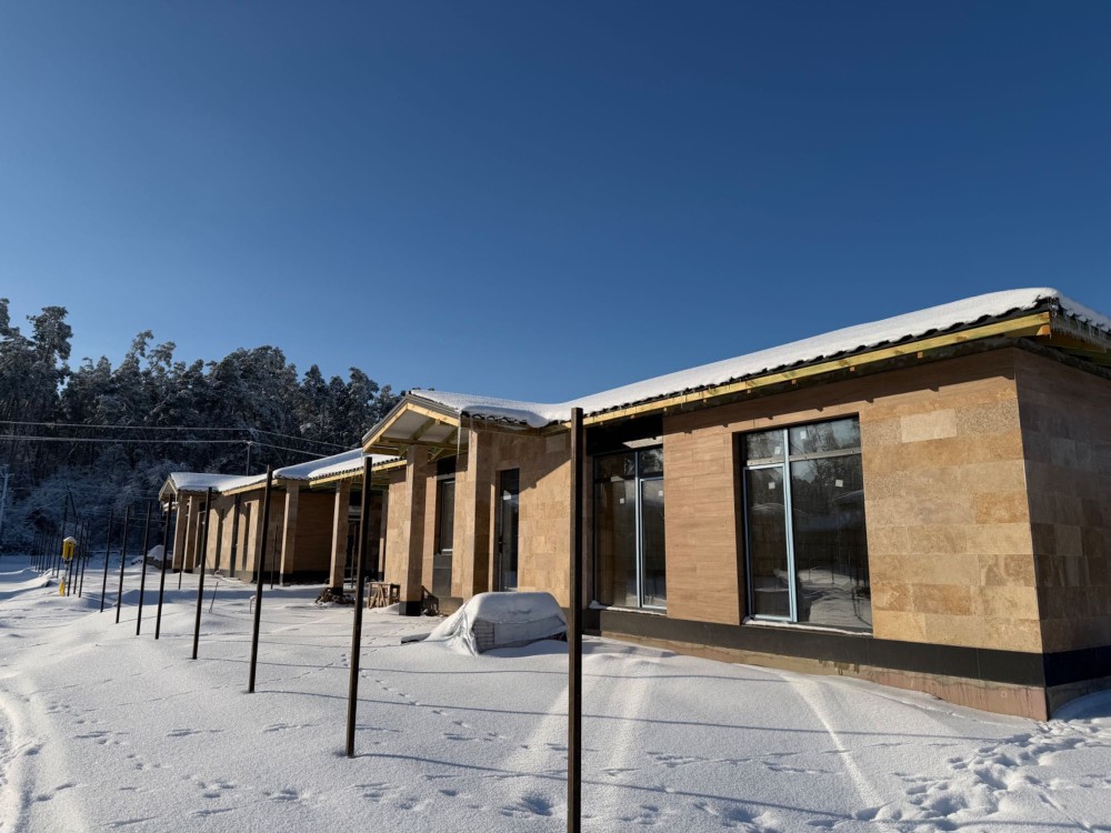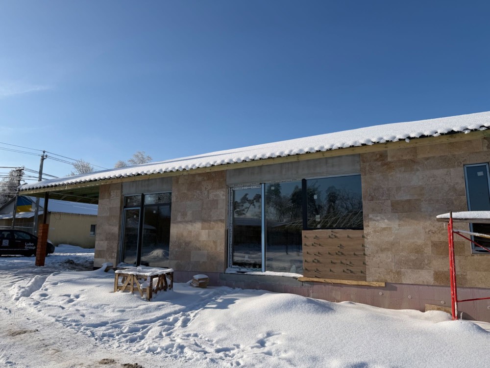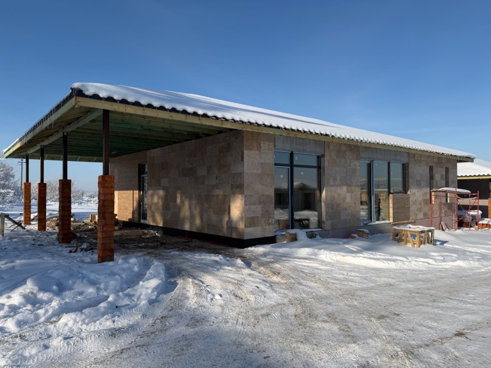 • Фасад – травертин у поєднанні з керамогранітною плиткою (або короїд + плитка — залежно від комплектації)