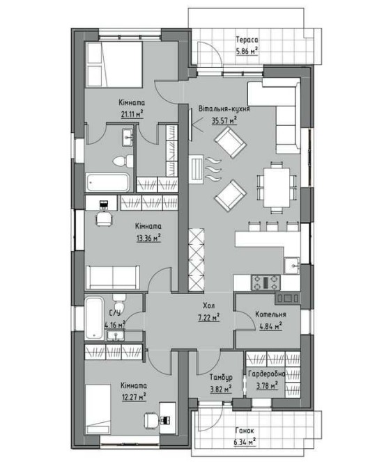 - три кімнати (дві дитячі та майстер-спальня з власним санвузлом і гардеробом), ще один санвузол,