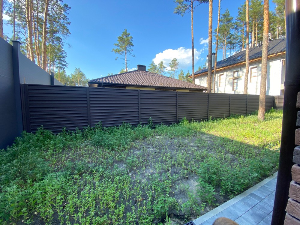 Земельна ділянка огороджена металевим парканом та воротами під автоматику.